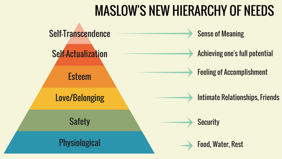 매슬로우는 생존 - 안전 및 건강- 인간관계 - 성취감- 역량발휘(재능과 기술 표현) - 의미(내가 의미를 두고 믿는 존재) 욕구 순서의 역 피라미드를 다시 한 번 제시했다. 가장 중요한 것이 생존이 아닌 '의미' 있는 삶이 된 것이다.