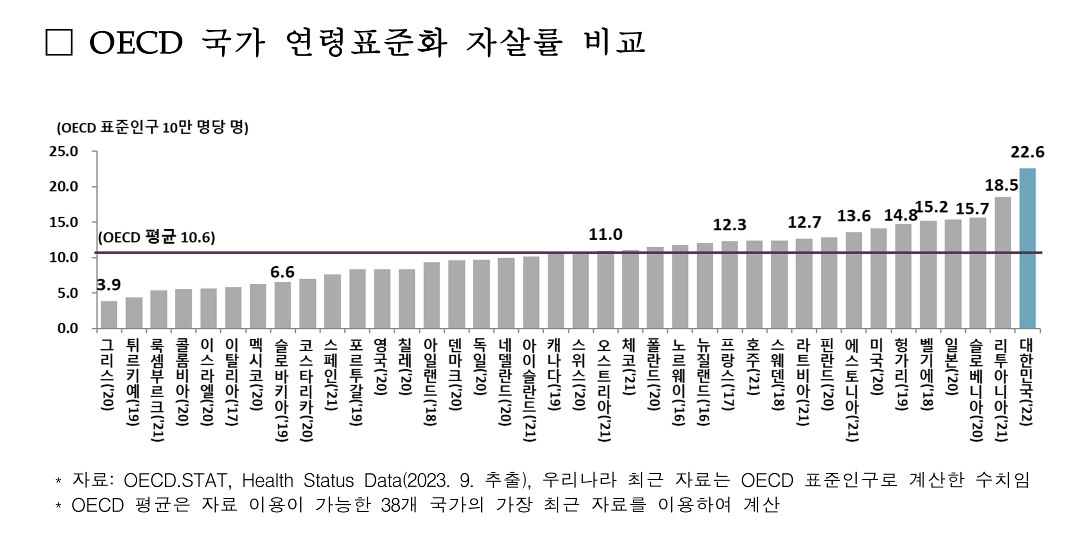 22년 기준 OEDC국가 평균 자살률은 10만명당 10.6이었고, 한국은 무려 2배가 많은 22.6명을 기록했다.